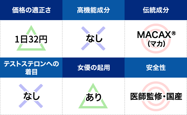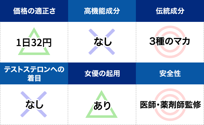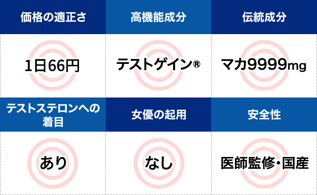 マカ・亜鉛・クラチャイダムなどの誰もが一度は試したことのある成分を中心に配合しており、まさにスタンダードにこだわった商品だと言えるだろう。